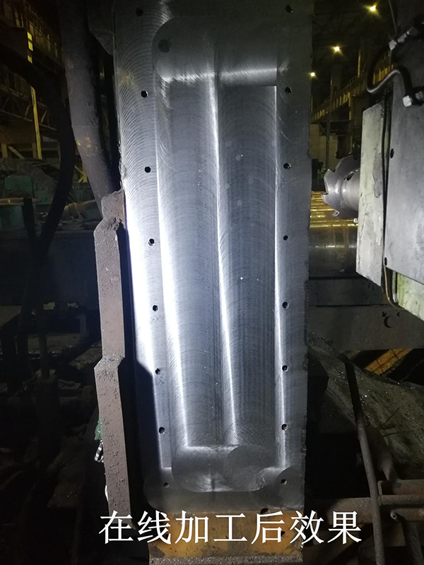2020年5月20日,我公司組織20余人的施工隊伍進入現(xiàn)場,對粗軋機所有窗口襯板面進行在線加工,激光修復,單塊損傷量大約在2-3mm,最深腐蝕加工量達到8mm,經過180多小時不間斷連續(xù)施工,提前36小時順利完成維修任務,恢復牌坊使用精度要求,一次交檢合格,獲得了廠家認可和贊揚。